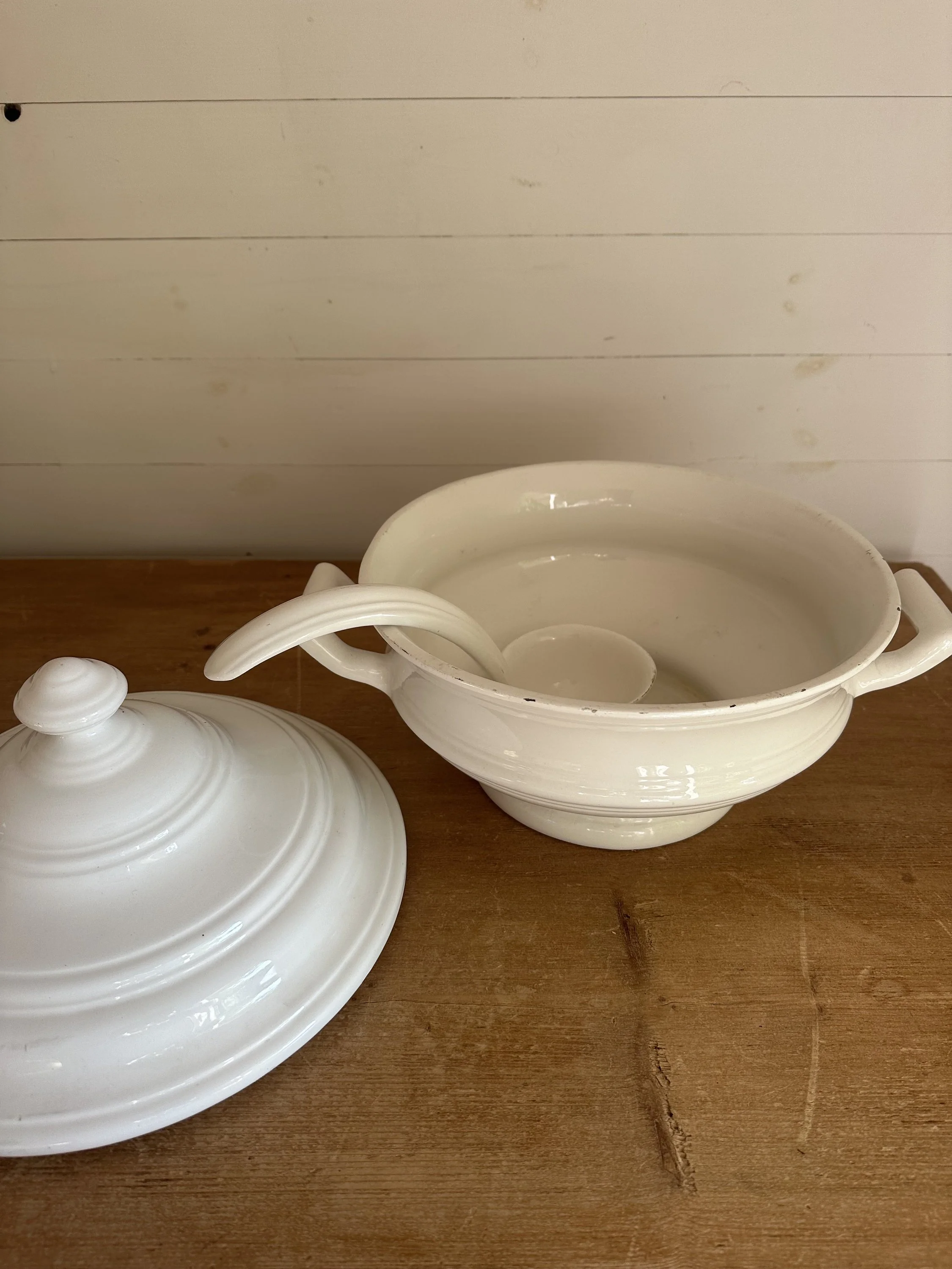 Image 1 of 9 Image 2 of 9 Image 3 of 9 Image 4 of 9 Image 5 of 9 Image 6 of 9 Image 7 of 9 Image 8 of 9 Image 9 of 9 Exquisite Italian ceramic antique tureen Soupiere £75.00 A beautiful large vintage white Italian ceramic lidded Soupiere tureen with its original serving spoon. Fabulous serving piece in very good condition.Width including handles: 35cm Height: 28cm Add To Cart Added! A beautiful large vintage white Italian ceramic lidded Soupiere tureen with its original serving spoon. Fabulous serving piece in very good condition.Width including handles: 35cm Height: 28cm Reviews Reviewer Name Review Date Star Rating Description Posted on Etsy Product Show More