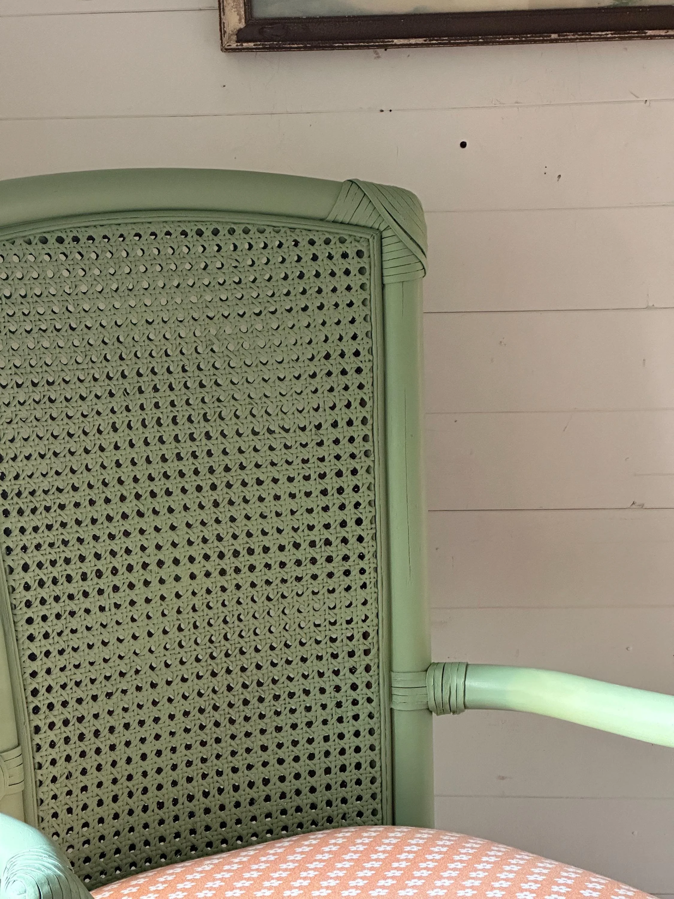 A charming vintage French bamboo chair. Painted in Farrow and Ball ‘Breakfast Room Green’ with a beautiful vintage orange and white floral seat. A very pretty piece to brighten your home